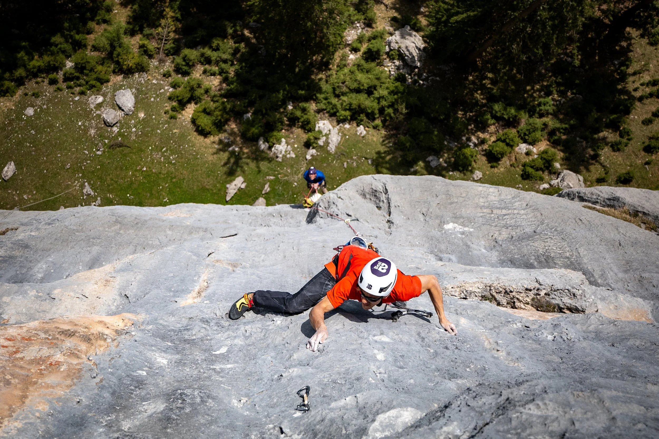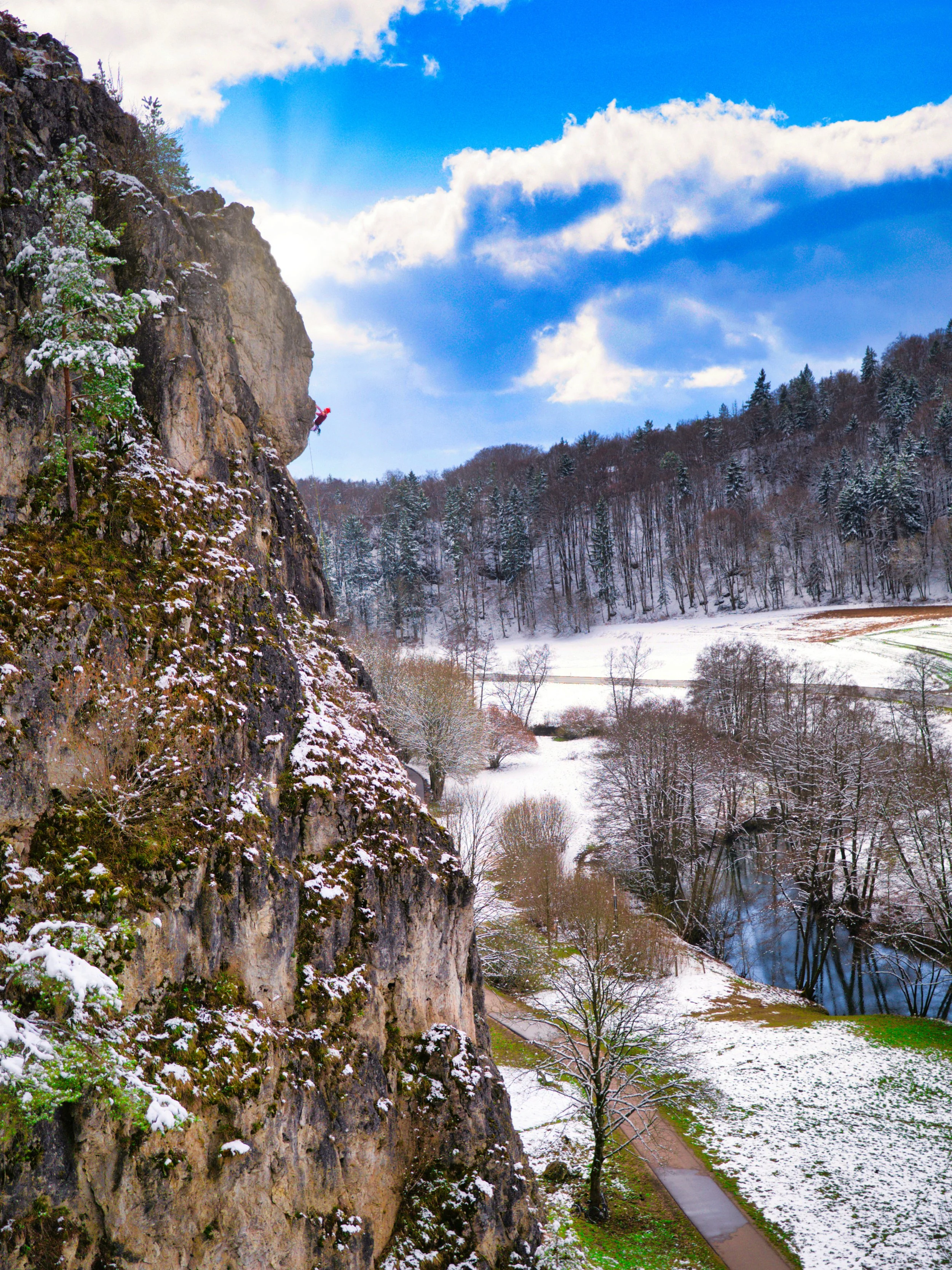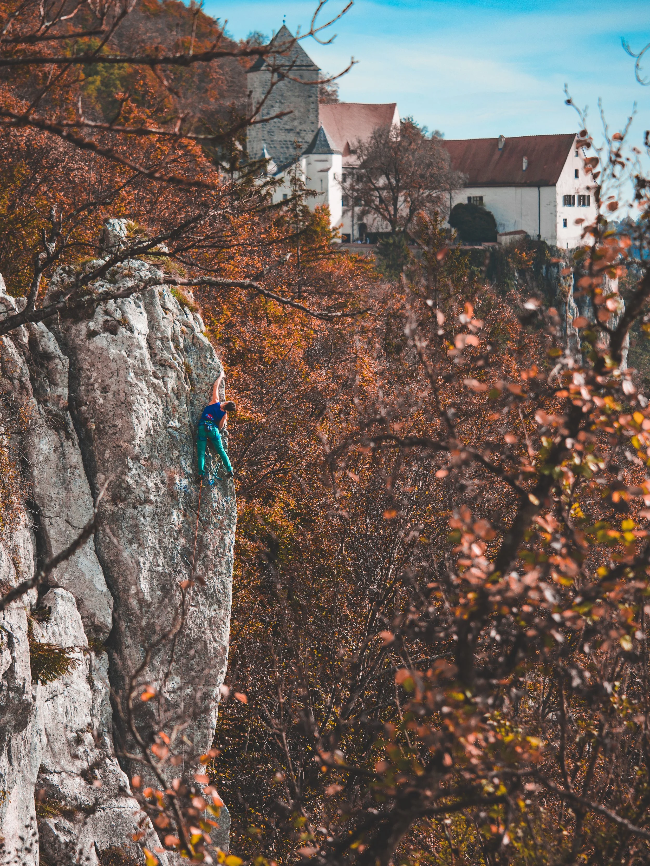 Begleitet Simon durch die 80 Meter hohe Römerwand im Donaudurchbruch. Es ist die schwierigste Mehrseillängenroute der Umgebung mit der spektakulären Crux kurz vorm letzten Stand.